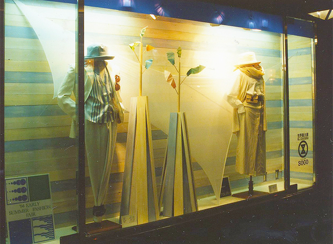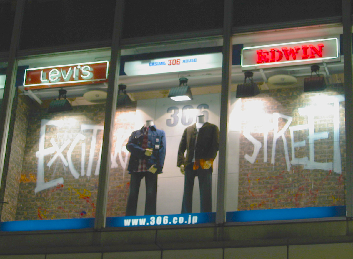 半透明の二層のグラフィック出力で、店内の要素や商品も見える演出を狙ったウィンドウディスプレイ。
