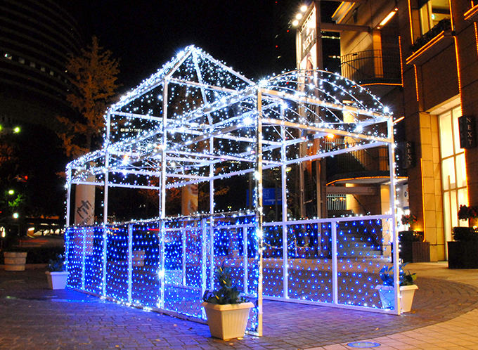 横浜港開港150周年に合わせ、横浜の古い駅舎と施設名のGATEを模しイルミネーションで再現。鉄骨で安全性を保ち撮影スポットとした。
