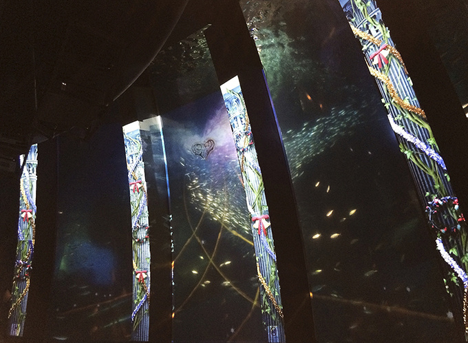 八景島SEA PARADISE シーズン演出。プロジェクションマッピングと連動させた、特殊シートを使い裸眼で楽しめる3D映像で、水槽内にバーチャルな神殿も再現。